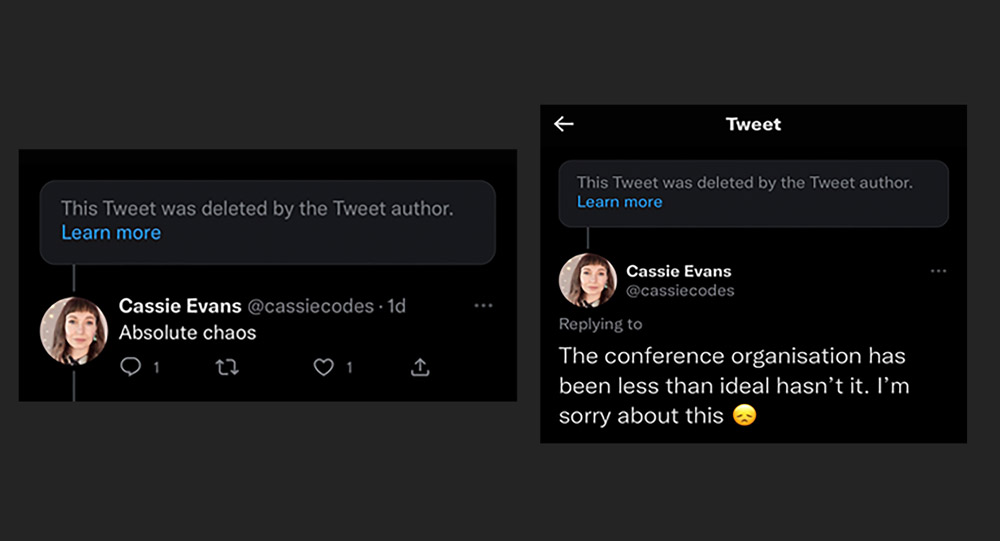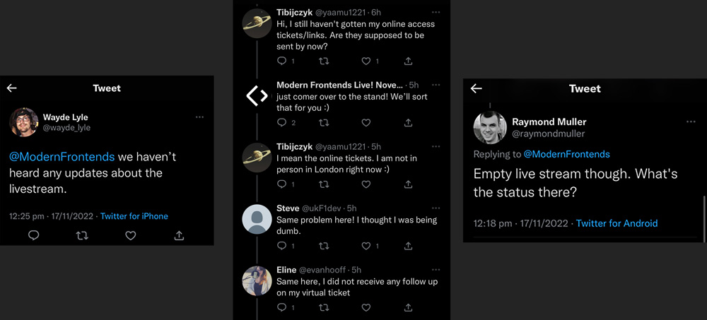 The day of the conference I noticed some more tweets regarding the live stream, or rather, the lack of a live stream. People couldn't access it. There was no communication. The conference and organiser were unresponsive. I contacted friends at the conference to see if they knew what was happening. Someone said they had received an email that morning stating a technical issue.
